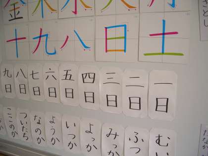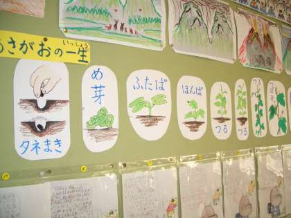 掲示板には、学習してきたことが分かりやすく掲示されていました。場面は、教科「日本語」と生活科の資料です。