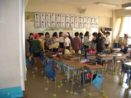 4年生の教室では、“音楽科”の授業にいく準備・・ならんでから音楽室へ移動です。