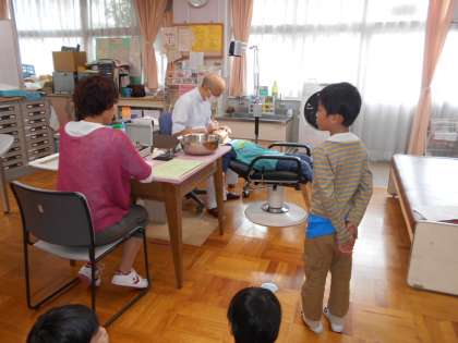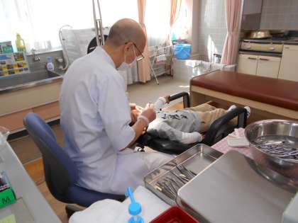 本校は全児童対象に春と秋の年2回の歯科検診を行っています。歯科校医の高見澤先生は、一人一人の子どもに歯の磨き方を丁寧にアドバイスをしてくださいます。