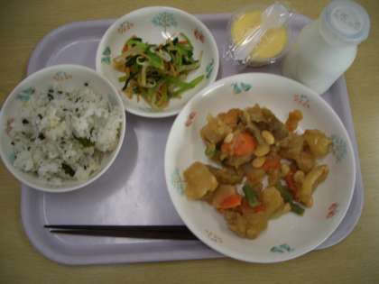 今日の献立は、わかめとじゃこのご飯、牛乳、豆入り筑前煮、野菜のからししょうゆかけです。画面のプリンは、12月の誕生日給食用です。