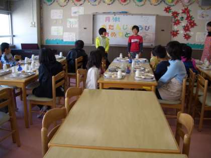 誕生日給食では、6年生がお祝いの言葉を言ってから、“いただきます”をします。