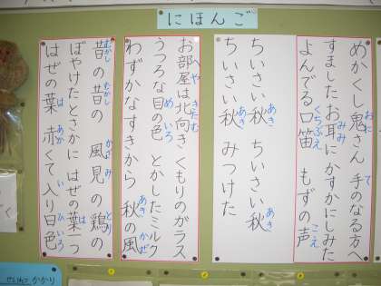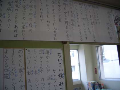 1年生の教室には、教科「日本語」の学習したことが、分かるように掲示がしてあります。“雨にもまけず”や“小さい秋みつけた”などの詩を見ていると、1年生の女の子が、“これ、みんな暗唱したんだよ。”と、教えてくれました。