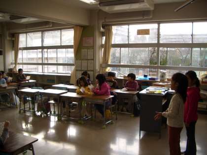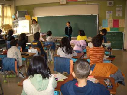 3年生の教室では、転校してきて初めての九品仏小での“日直”・・・日直の司会の流れが書いてあるカードを見て、堂々と日直の仕事をしていました。