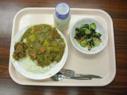 今日の献立 カレーライス 福神漬け わかめサラダ 牛乳