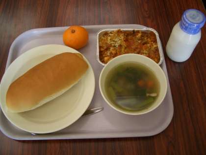 今日の献立は、ミルクパン、牛乳、豆腐のグラタン、コンソメスープ、くだものです。