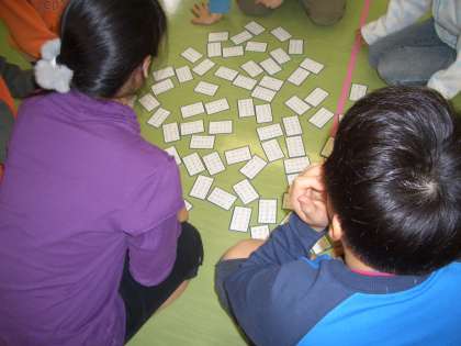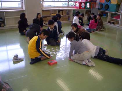 4年生は、多目的ホールで、“百人一首”に挑戦していました。先生が、上の句を読んで、子どもたちがグループに分かれて競い合っていました。よく見て、素早くとる子どもが多かったです。