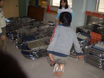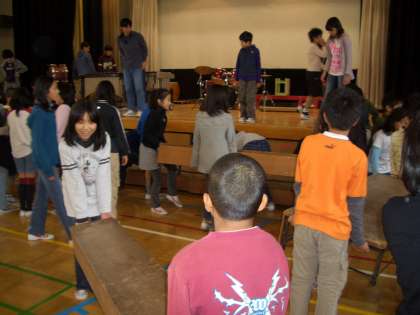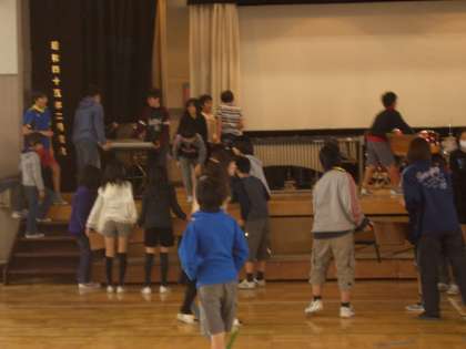 今日の中休みを利用して、5・6年生が“音楽学習発表会の会場準備”を行いました。5年生も6年生も協力し合って、椅子だし、楽器運び、ひな壇準備等などに大活躍です。 これで、12月18日(金)に行う“音楽学習発表会”の準備もできました。