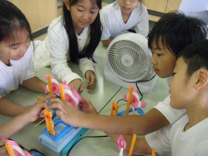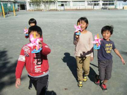 「どのようにすれば風車がよく回るのか」という学習問題を解決するために、校庭で確かめてみました。走り回って風を起こしたり、ジャングルジムに乗って高いところで風車を回したりしました。
