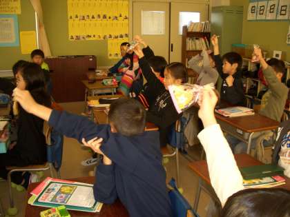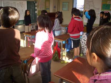 2年生の教室では、“朝の会”いつものように“あいさつ”をすると、“かけざん九九”の暗唱をします。2のだんから9のだんまで・・・リズムも答えも正確でした。