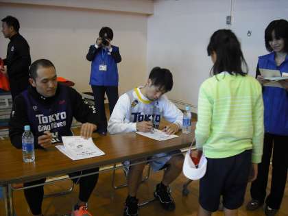 今日は、BJリーグの東京サンレーブスというチームからプロ選手2人が来ました。来てくださったのは、大森勇選手と師玉祐一選手。