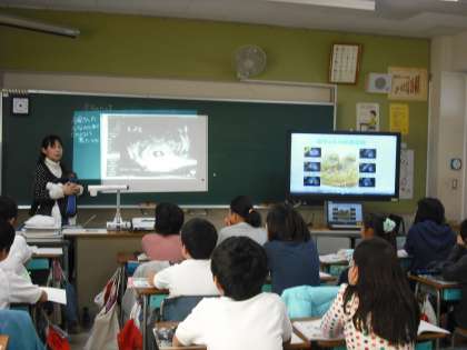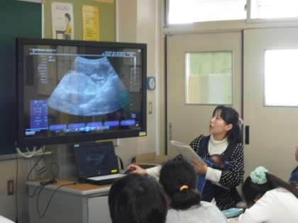 5年生では、理科で「人のたんじょう」について学習しています。今日は、9月に赤ちゃんを生んだばかりの川村先生をゲストティーチャーに呼び、『赤ちゃんはお母さんのおなかの中でどのように育っていくのか』を超音波画像のDVDや写真を見ながら教えてもらいました。