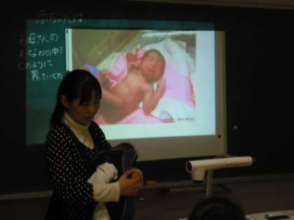 授業の最後には、もうすぐ3カ月になる赤ちゃんを間近かで見せてもらい、「かわいい」と大喜びでした。