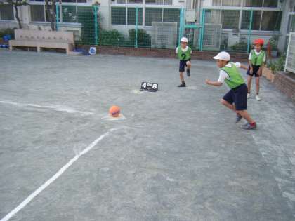 3年生はキックベースボールを行っています。今日は、相手のいないところにボールを蹴ること、ボールを投げてアウトにすることを目標に行いました。