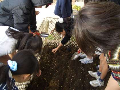 4年生は、学級園に“ラナンキュラス・むすかり、スノードロップ”の球根を植えました。狭い学級園ですが、先生の指示に従ってスムースに作業をしていました。