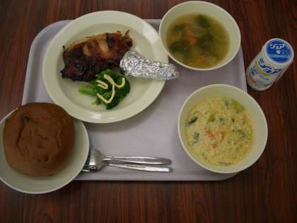 最後の給食ということで、今日の献立は、チョコチップパン、ジョア、ローストチキン、チーズのふわふわスープ、茹でブロッコリーマヨネーズぞえです。最期の給食もアレルギー対応食を調理員さんが作ってくれました。