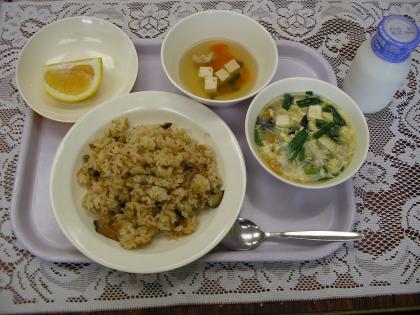 今日のメニューは、中華おこわ、にらたまスープ、くだもの、牛乳です。