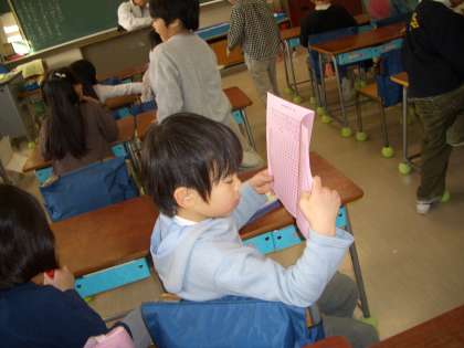 1年生の教室では、朝の会の前・・・・画面の子どもは、縄跳びれんしゅうカードを見ながら、自分のとべる技、これから抽選する技の確認をしていました。先生は、子ども達から、カードを集めて、子ども達の練習の進度を確認して、指導に生かしています。