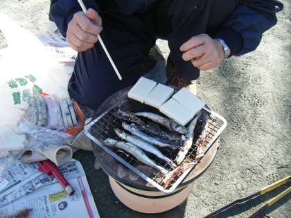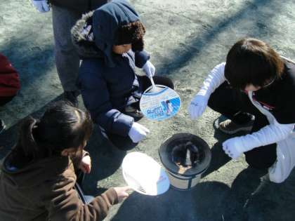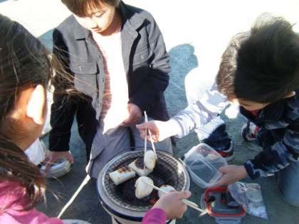 なかなか炭に火がつきませんでしたが、粘り強く取り組み、9つすべての班が成功しました。最後に、七輪の上でおもちを焼いておいしく食べることができました。