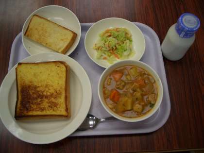 今日の献立は、フレンチトースト、牛乳、ビーンズシチュー、キャベツサラダです。