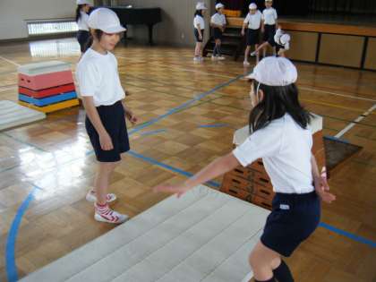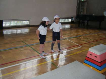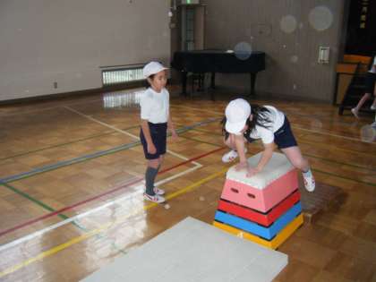 3年生では、開脚跳びと台上前転を身に付けるようになっています。