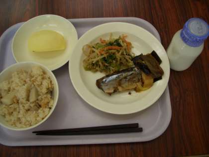 今日の献立は、里いもごはん、牛乳、さんまの松前煮、野菜のごまだれかけ、くだものです。
