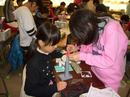 5年生の教室では、“理科の実験道具作り”“おもりのふれかた”の実験道具を説明書を見ながら、友達と工夫しながら作成していました。