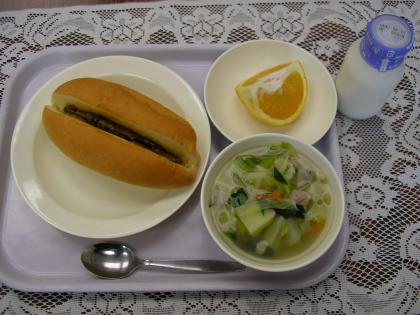 今日のメニューは、ドライカレーサンド、ベーコンと野菜スープ、