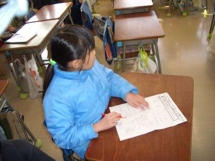 2年生の教室では、“宿題の答え合わせ”係りを中心に各自がプリントに○をつけています。どの子どもも真剣です。