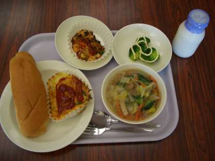 今日の献立は、ミルクパン、牛乳、チーズ入り卵焼き、白菜と春雨のスープ、ゆでブロッコリーです。