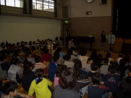 前半、後半に分かれて各学年のお店をまわり楽しみます。その集会が今朝、行われました。体育館の中なので、画面が暗くなってしまいました。