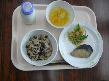 お赤飯、牛乳、魚の照り焼き、菜の花のおひたし、フルーツポンチ