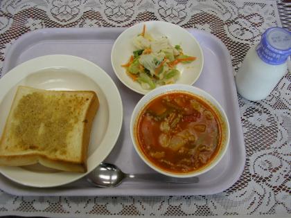 今日のメニューは、セサミトースト、ミネストローネ、キャベツサラダ、牛乳です。