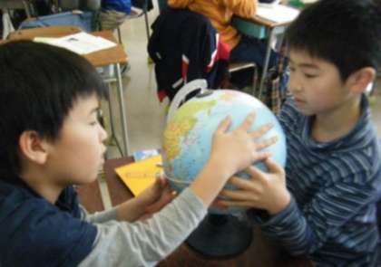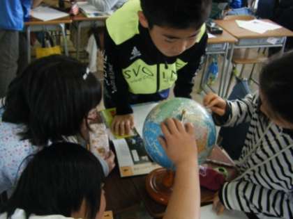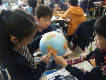 「写真で見えないところは、実際の地球を見よう」と縮尺された地球、つまり地球儀で確認しました。上から、横から、下から、360度から真剣に見ていました。