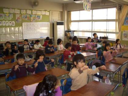 1年生の教室では、朝の会の前に、昨日生活科の時間に作った“ぶんぶんごま”をまわしていました。いろいろな模様をこまに描いていて、きれいでした。