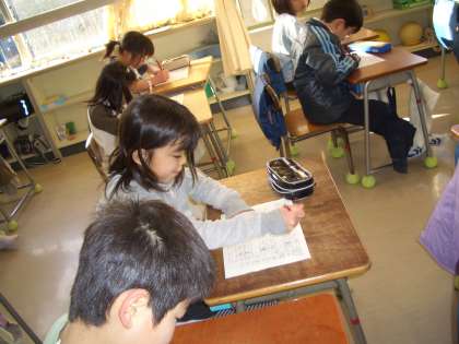 2年生の教室では、“朝 自習”で答え合わせと正しい、丁寧な“字”が書けているか自分の周りの友達とプリントを交換して確認をしていました。