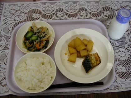 今日のメニューは、ご飯、魚の塩焼き、じゃがいもの甘辛煮、和風サラダ、牛乳です。