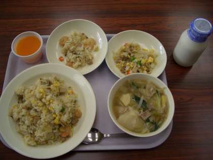 今日の献立は、チャーハン、牛乳、ワンタンスープ、キャロットゼリーです。小皿は、アレルギー対応食を調理員さんが作ってくれました。どの子も安心して給食をいただきました。
