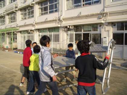 九品仏小では、毎週月曜に、“児童朝会”を行います。週番の先生が整列させ、6年生の代表が2名朝礼台の前に立ち、話をし、校長先生と全校児童であいさつ・・・校長先生の話、週番の先生の話・・・音楽に合わせて昇降口へ・・・そのあと、画面のように6年生児童が朝礼台を片付けます。・・・