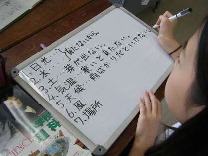 まずは個人で、植物を育てた経験に基づいて考えました。たくさん出た条件から今度はグループで条件を絞りました。