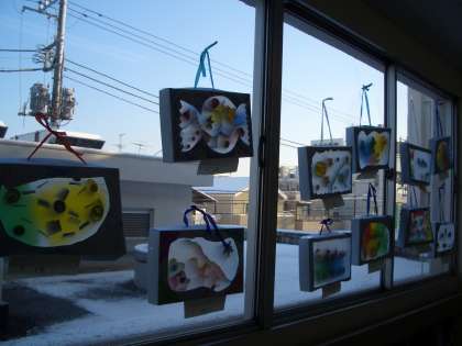 廊下には、図工の作品(ステンドグラス)が窓に張ってあり、外の光がきれいに映っていました。