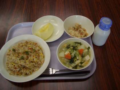 今日の献立は、そぼろごはん、牛乳、味噌汁、くだものです。今日もアレルギー対応食を調理員さんが作りました。どの子どもおいしくいただくことができました。