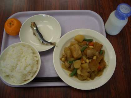 今日の献立は、ごはん、牛乳、いわしの丸干し、豆入り筑前煮、くだものです。