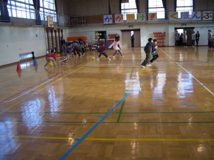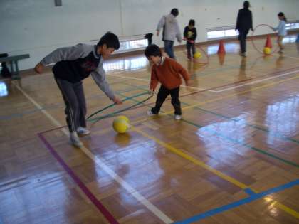 今朝、体育館にて“児童集会:フラフープボール”のゲームを“縦割り班”で行いました。異学年の息もぴったりでした。いろいろな学年のペアーでゲームを楽しみました。