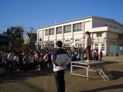 全校児童朝会で一週間のスタート!本校の児童朝会では、校長先生が朝礼台に上がった時に、6年生の2名の児童が朝礼台の前に立ち、季節や行事に関連したことを話して、全校であいさつをしています。そのあと、校長先生の話、週番の先生の話をします。