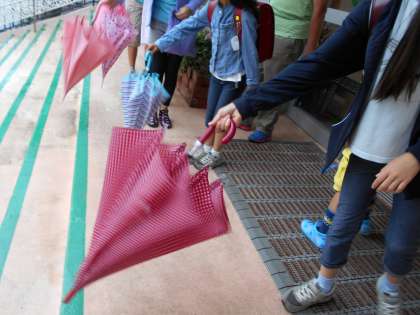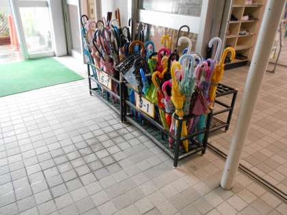今日は朝から雨です。玄関では、傘のしずくを落としてから校舎に入るよう先生が呼びかけていました。小さなことですが、雨の日の大切な思いやりです。