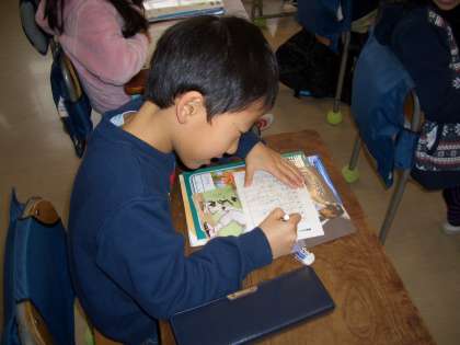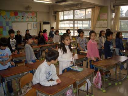 2年生の教室では、“朝の会”で教科“日本語”で学習した宮沢賢治の“雨にも負けず”の詩を音読していました。難しい詩ですが・・・上手にできていました。