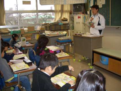 1年生の教室では、“算数科”の勉強を教科書と模造紙に拡大した資料を使って行っていました。