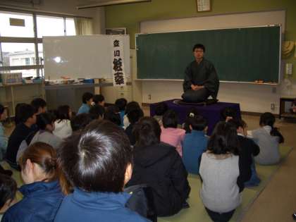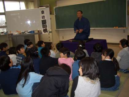 4年生は、“総合的な学習の時間”で立川流の落語家さん2名をゲストティチャーに落語についての説明、扇子、日本手ぬぐいの役目、衣裳(着物について)などの説明を聞き、落語を演じてもらいました。