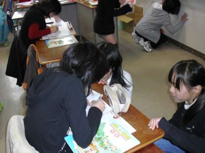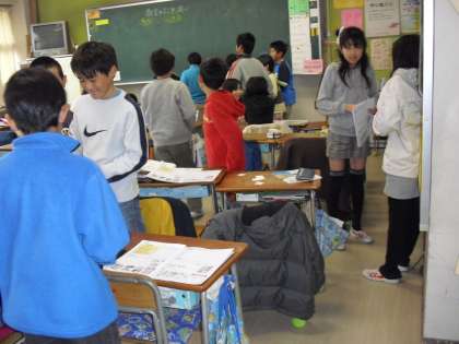 5年生は、“家庭科”教室の汚れ・・・いつも使っている教室のどのようなところがよごれているか・・・調べていました。グループで協力し合いながら・・・・。