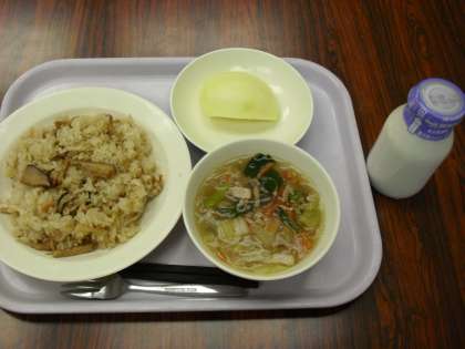 今日の献立は、中華おこわ、牛乳、白菜と春雨のスープ、くだものです。
